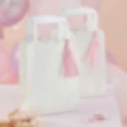 5 st. vita kalaspåsar med motiv av sjöjungfrufjäll samt rosa tassels hängandes vid de pärlemorskimrande handtagen. Fyll påsarna med godis och några överraskningar från havet och servera gästerna dessa sedan när det är dags för kalas med sjöjungfrutema.