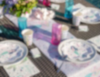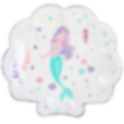 10 st. snäckformade tallrikar i en vit färg med silverfolierade kanter och med motiv av en söt sjöjungfru som är omringad av färggranna växter och snäckor från havet. Perfekta att duka fram på bordet inför sjöjungfrukalaset. Kombinera tallrikarna med muggar, servetter etc. från samma tema för ett tjusigt utseende.