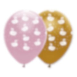 6 st. latexballonger i färgerna rosa och guld och med motiv av vackra svanar. Fina att pynta med inför kalaset med Stylish Swan som tema. Ballongerna blir ca 30 cm i diameter uppblåsta och kan blåsas upp med både vanlig luft och helium.