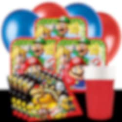 Detta färdiga kalaspaket med Super Mario inkluderar tallrikar (18 cm), röda pappmuggar (266 ml) och servetter (33 x 33 cm) för 8, 16 eller 24 personer. Utöver det så ingår 10 st. blå och 10 st. röda ballonger och en svart bordsduk (137 x 274 cm). I paketet för 24 gäster så ingår 2 st. bordsdukar.