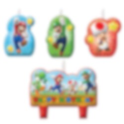 Fira med stil tillsammans med Super Mario och hans vänner! Detta set med fyra färgglada tårtljus, föreställande Mario, Luigi, Toad och Yoshi, är det perfekta tillskottet till en födelsedagstårta med Super Mario-tema.