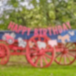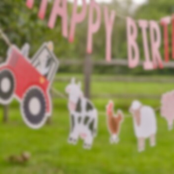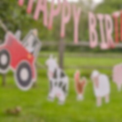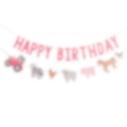 Fin girlang med texten "Happy Birthday" och med motiv av olika bondgårdsdjur. Girlangen är gjord av papp och är 4 meter lång.