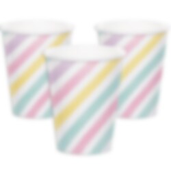8 st. pappersmuggar med fina pastellfärgade ränder. Muggarna är ca 10 cm höga och rymmer ca 266 ml.
