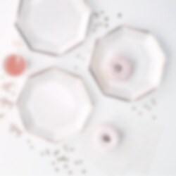 8 st. snygga vita tallrikar med roséguldfolierade prickar och kanter. Använd dessa till kalaset, festen eller babyshowern. Tallrikarna är tillverkade av papper och är ca 23 cm i diameter.