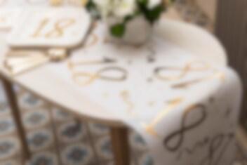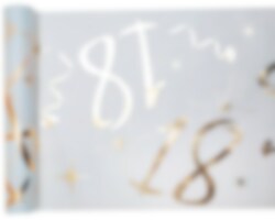Vit bordslöpare med dekorativa mönster och talet 18 i guldfolie. Den här bordslöparen kommer i en praktisk rulle och den är 30 cm bred och hela 5 meter lång. Det räcker till flera bord och en stor fest. Materialet är 100 % polyester.