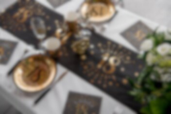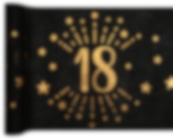 Svart bordslöpare med dekorativa mönster och talet 18 i guldfolie. Den här bordslöparen kommer i en praktisk rulle och den är 30 cm bred och hela 5 meter lång. Det räcker till flera bord och en stor fest. Materialet är 100 % polyester.