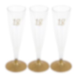 6 st. vackra och praktiska engångsglas i Champagne-stil. Plastglasen är trevliga att både duka med och mingla med dina gäster med på 18-årsfesten. Glasen rymmer 14 cl. och står på en fot av guld och har talet "18" tryckt upptill.