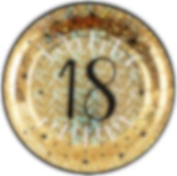 10 st. glittrande tallrikar i guld med talet "18" i svart. De här tallrikarna är vackra och perfekta att duka fram med till 18-årsfesten. Tallrikarna är gjorda av papp och har en diameter om 22,5 cm.