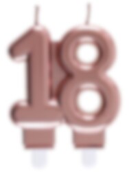 Tårtljus i roséguld elegant format som talet 18. Tårtljuset har en storlek om 7,5 x 9 cm.