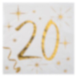 20 st. vita servetter med dekorativa mönster och talet 20 i guldfolie. De här servetterna är perfekta när du dukar upp till en 20-årsfest. Servetterna har tre lager och känns lyxiga. Outvikta har dem ett mått av 12,5 x 12,5 cm.