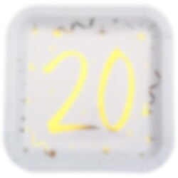 10 st. vita papptallrikar med dekorativa mönster och talet 20 i guldfolie. De här fyrkantiga tallrikarna är ett fint inslag till 20-årsfestens dukning. Tallrikarna är 23 x 23 cm stora.
