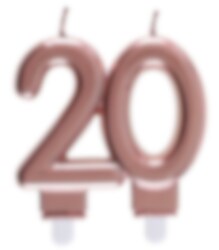 Tårtljus i roséguld elegant format som talet 20. Tårtljuset har en storlek om 7,5 x 9 cm.