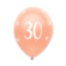 6 st. ballonger i roséguld färg med motiv från siffran "30" och stjärnor i vitt. En vacker dekoration som kan blåsas upp inför 30-årsdagen. Ballongerna är ca 30 cm i diameter uppblåsta och kan blåsas upp med luft eller helium.