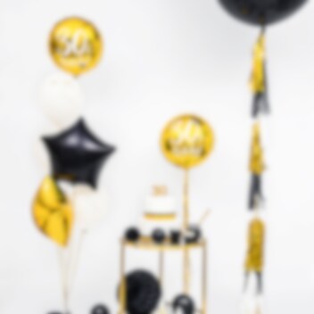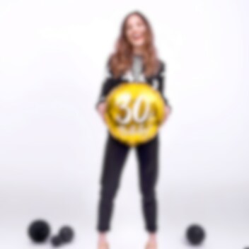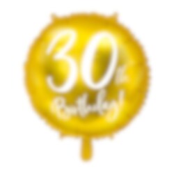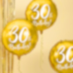 Elegant folieballong i guldmetallic färg samt med vitt motiv av texten "30th Birthday!". Blås upp den med luft eller helium och att dekorera med inför 30-årsfesten. Ballongen blir ca. 45 cm stor.