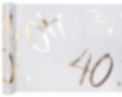 Vit bordslöpare med dekorativa mönster och talet 40 i guldfolie. Den här bordslöparen kommer i en praktisk rulle och den är 30 cm bred och hela 5 meter lång. Det räcker till flera bord och en stor fest. Materialet är 100 % polyester.