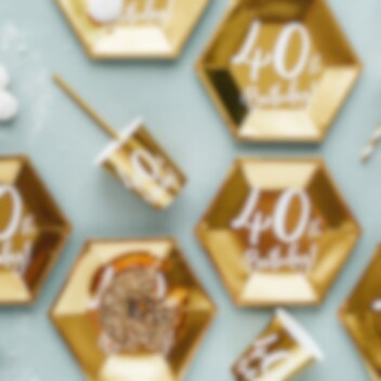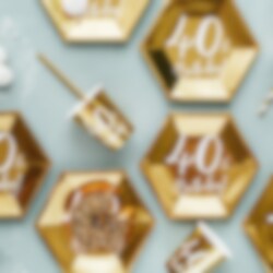 6 st. guldfolierade papptallrikar med texten "40th Birthday!" i vitt. Trevligt att duka fram på bordet inför din 40-årsdag. Tallrikarna är ca 20 cm stora.