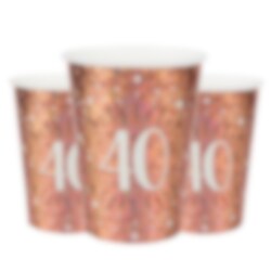 10 st. glittrande pappmuggar i roseguld med talet "40". De här muggarna är riktigt vackra och dekorativa när du dukar upp till en 40-årsfest. Muggarna är ca 10 cm. höga och rymmer ca 270 ml.