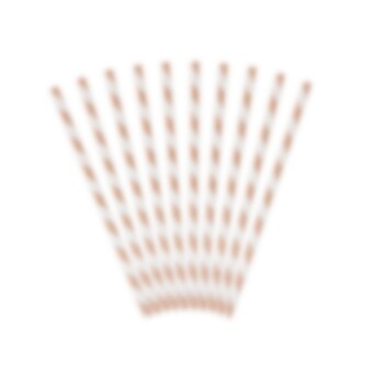 10 st. snygga pappsugrör i vitt med ränder i metallic roséguld. Sugrören är ca 19,5 cm höga.