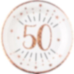 10 st. vackra tallrikar som glittrar i roseguld med talet "50" i mitten. De här tallrikarna är effektfulla och perfekta att använda till 50-årsfesten. Tallrikarna är tillverkade av papp och har en diameter om 22,5 cm.