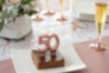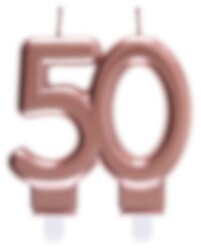 Tårtljus i roséguld elegant format som talet 50. Tårtljuset har en storlek om 7,5 x 9 cm.