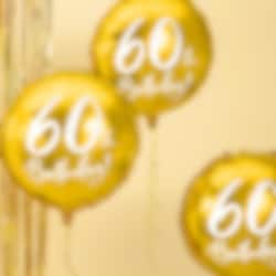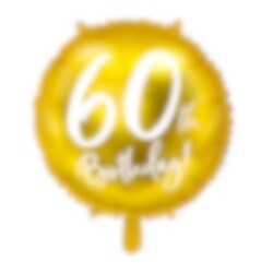 Elegant folieballong i guldmetallic färg samt med vitt tryck med texten "60th Birthday!". Perfekt dekoration att fylla med luft eller helium inför 60-årsfirandet. Ballongen har en storlek på ca 45 cm.