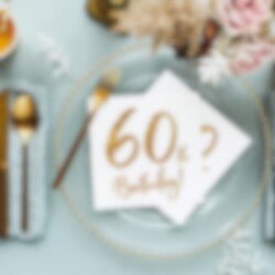 20 st. servetter i vitt med guldfolierat tryck med texten "60th Birthday!". Perfekta att duka fram på bordet inför 60-årsdagen. Servetterna är i standardstorlek, ca 33 x 33 cm utvikta.