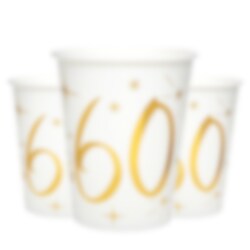 10 st. vita pappmuggar med dekorativa stjärnor och talet 60 i guldfolie. De här muggarna är verkligen vackra och ett perfekt inslag till 60-årsfestens dukning. Muggarna är 10 cm. höga och rymmer 270 ml.