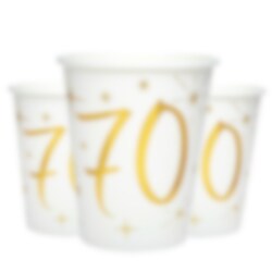 10 st. vita pappmuggar med dekorativa stjärnor och talet 70 i guldfolie. De här muggarna är verkligen vackra och ett perfekt inslag till 70-årsfestens dukning. Muggarna är 10 cm. höga och rymmer 270 ml.