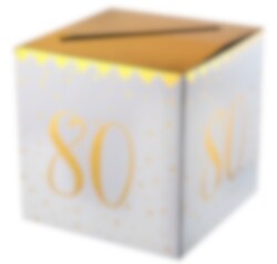Denna presentlåda i vitt och guld är perfekt för din 80-årsdag. Oavsett om du vill samla in pengar, gratulationer eller hälsningar. Lådan har en diagonal skåra i det gyllene locket och talet 80 på varje sida. Den är kubformad och 20 x 20 cm stor.