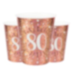 10 st. glittrande pappmuggar i roseguld med talet "80". De här muggarna är riktigt vackra och dekorativa när du dukar upp till en 80-årsfest. Muggarna är ca 10 cm. höga och rymmer ca 270 ml.