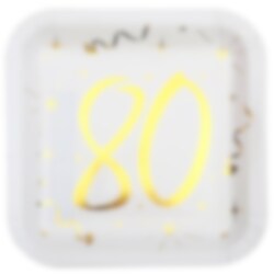 10 st. vita papptallrikar med dekorativa mönster och talet 80 i guldfolie. De här fyrkantiga tallrikarna är ett fint inslag till 80-årsfestens dukning. Tallrikarna är 23 x 23 cm stora.