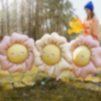 Denna charmiga folieballong i form av en blomma har ett leende ansikte, mjuka rosa toner och är perfekt för babyshower, barnkalas och sommarens fester.