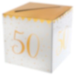 Denna presentlåda i vitt och guld är perfekt för din 50-årsdag. Oavsett om du vill samla in pengar, gratulationer eller hälsningar. Lådan har en diagonal skåra i det gyllene locket och talet 50 på varje sida. Den är kubformad och 20 x 20 cm stor.