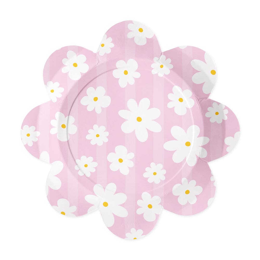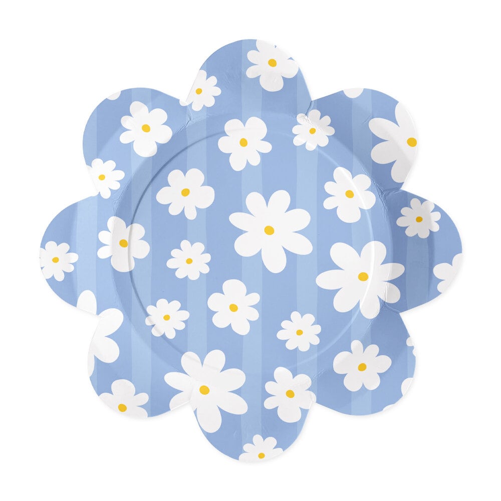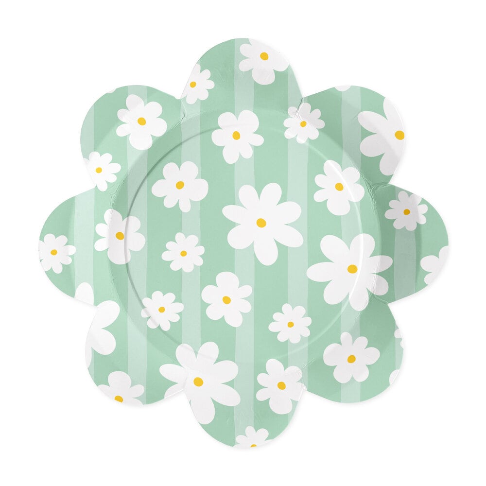 Duka upp till en somrig och charmig fest med dessa fina tallrikar i blomform. Tallrikarna går i mjuka pastellfärger som rosa, blått och grönt och är dekorerade med vita prästkragar, vilket gör dem till ett fint inslag på födelsedag, babyshower, picknick eller sommarfest.