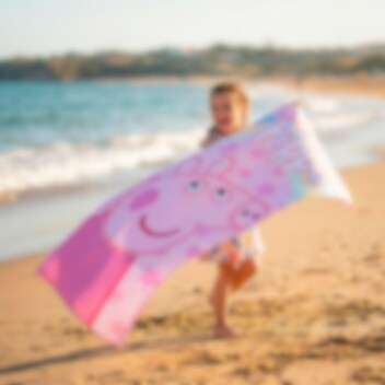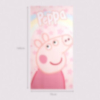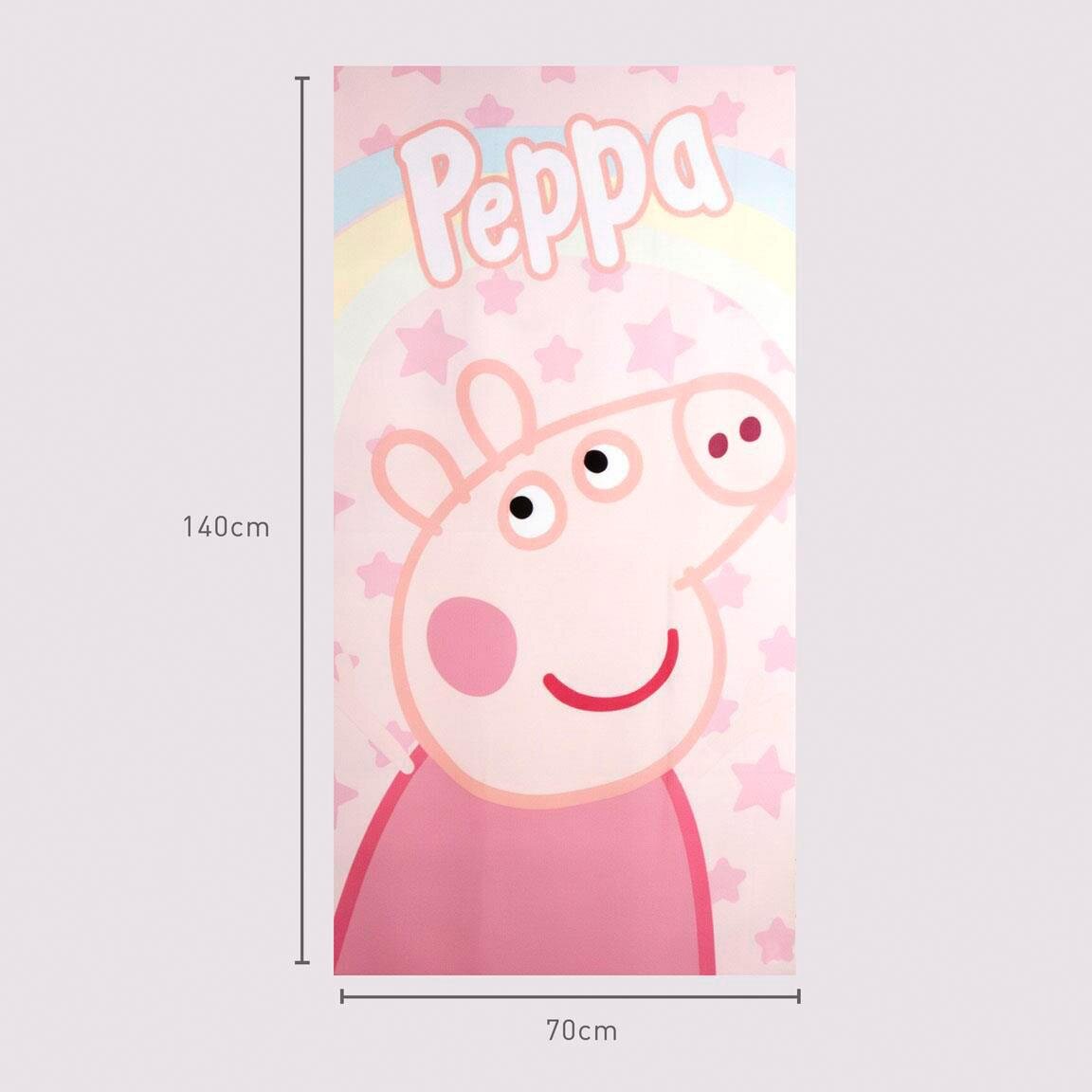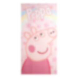 Denna färgglada Peppa Pig badhandduk pryds av ett stort motiv på Peppa mot en rosa bakgrund fylld med stjärnor och en regnbåge. Handduken är tillverkad av 100 % snabbtorkande polyester, vilket gör den idealisk att ta med till både stranden och poolen.