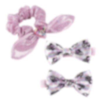 Gör frisyren extra festliga med detta glittriga 3-pack håraccessoarer med Mimmi Pigg! Setet innehåller två fina hårspännen med rosetter i regnbågsskimrande tyg och Mimmi-motiv, samt en scrunchie i rosa glitter med charmigt kaninöronband.
