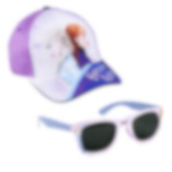 Ett komplett kit med både en vacker keps med Anna och Elsa på och ett par premium solglasögon, båda i barnstorlek. På de rosa-och blåtonade glasögonen finns motiv av de två systrarna från Disneys blockbuster Frozen och texten "Forever sisters".