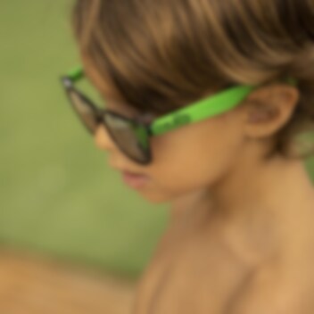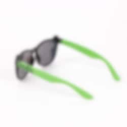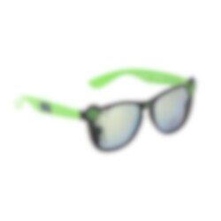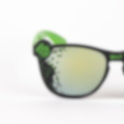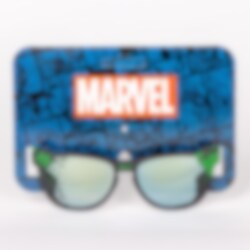 Premium solglasögon till barn i grönt och svart med tuffa detaljer från Hulken. På bågarna runt de tonade glasen återfinns superhjälten Hulken och hans kraftfulla knytnäve.