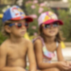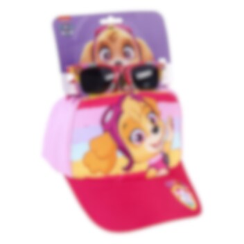 Ett komplett kit med både en söt rosa- och rödfärgad keps och ett par premium solglasögon, båda i barnstorlek. På glasögonen finns motiv av den söta hundvalpen Skye från Paw Patrol.