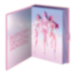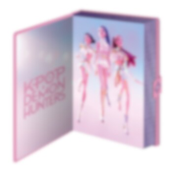 En lyxig anteckningsbok från K-Pop Demon Hunters med ett iriserande, skimrande omslag i rosa och lila toner. Pärmen pryds av "HuntrX"-texten i holografiskt tryck och stängs med en liten tryckknapps-detalj på sidan.