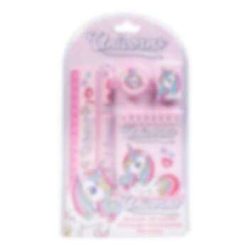 Detta söta skolset i rosa har allt som behövs för att göra läxorna lite roligare. Med en blyertspenna, linjal, suddgummi, pennvässare och en liten anteckningsbok är det perfekt för skolan, pysselstunden eller som en fin present till en enhörningsälskare.