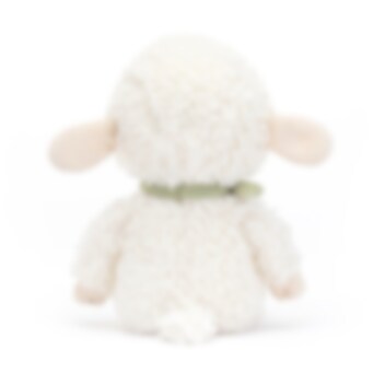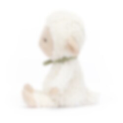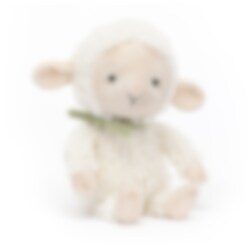 Ett sött och knubbigt lamm med lockig vit ull, kluvna små klövar och en snygg liten grön knythalsduk runt halsen. Ett mäktigt gosigt litet lamm med en söt liten stump till svans och en kramgo kompis att älska. Handtvättas vid behov.