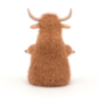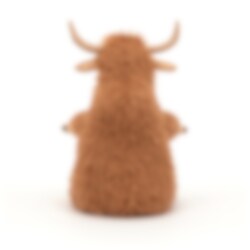 En ganska knubbig och härligt fluffig skotsk höglands ko som sitter och vilar efter att ha busat runt på de gröna ängarna. Med sin tjocka rödbruna päls, ett glatt leende på den tvåfärgade mulen, chokladbruna hovar och fina svängda horn i mocka-imitation är denna älskling en kramgo vän att älska. Handtvättas vid behov.