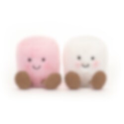 Möt det charmiga marshmallow-paret, klädda i vitt och ljusrosa med lekfulla ben i ljusbrun manchester. Deras glada leenden och rosiga kinder utstrålar glädje, och de är sammanlänkade med ett elegant rosa satinband som symboliserar deras eviga vänskap. Dessa kärleksfulla gosedjur är perfekta som gosiga kompanjoner för barn av alla åldrar. Lätt att sköta om, de kan maskintvättas på 30°C skontvätt och hängtorkas vid behov. Storlek: cirka 9 x 15 cm, de är perfekta för kramar och kärlek. Tillverkad av polyester.