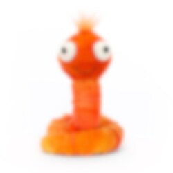 En charmig mask i skiftande eldigt orange nyanser, med ihoprullad kropp och huvudet högt. En tuff liten filur med aningen upphöjda cirklar över hela kroppen, en liten spretig hårtofs, stora runda ögon och ett riktigt glatt leende. En glad och stöttande kompis som kan få dig att le. Handtvättas vid behov.