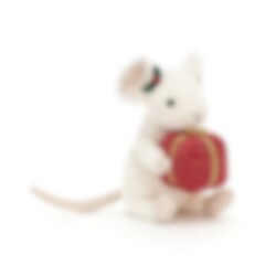 Denna gosiga lilla vita mus vill sprida julglädje med sitt glittriga röda paket med guldsnöre och har dekorerat sig med järneksblad och ett rött bär för en extra julig känsla. Tillverkad av 100% polyester och handtvättas vid behov.
