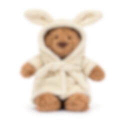 Gulligt gosedjur som föreställer en teddybjörn i en vit avtagbar morgonrock. En perfekt kamrat till den som älskar teddybjörnar.