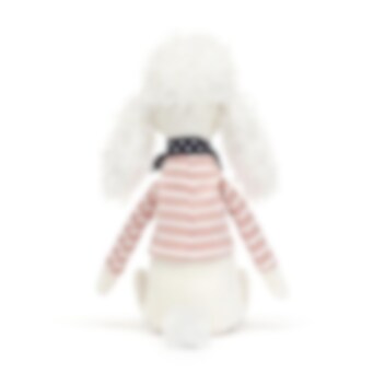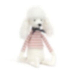 Denna stiliga pudel är klädd i en snygg randig tröja med en liten prickig halsduk knuten runt halsen och gör det mesta av sin karakteristiska pudel-frisyr samt hängande öron med fantastiskt lockig och fluffig vit päls. Denna tankfulla filur älskar att hänga med sina vänner och tänka ut små roliga verser om vardagens problem och konstigheter. Tillverkad av 77% polyester, 23% bomull och handtvättas vid behov.