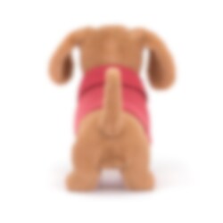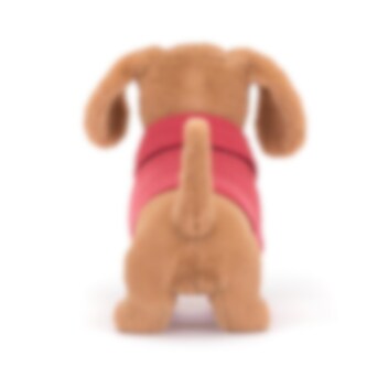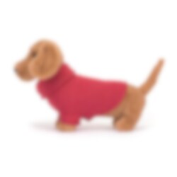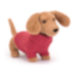 En söt liten ljusbrun tax med en snygg hallon-rosa stickad tröja som håller den varm. Kortväxt men med stort självförtroende ser denna lilla krabat alltid fram emot att ge sig ut på äventyr eller leka men kan ibland nöja sig med en härlig mysstund. Tillverkad av 63% polyester, 37% akryl och handtvättas vid behov.
