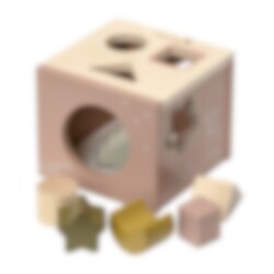 Plocklådan innehåller 6 st. träklossar i olika former och färger. Lådans mått är 13,5 x 13,5 x 11,5 cm.